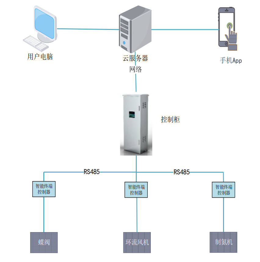 控制柜同時(shí)也給平臺提供了控制接口,平臺通過(guò)控制柜也可以進(jìn)行氣調控制, 包括智能氣調的方案執行。